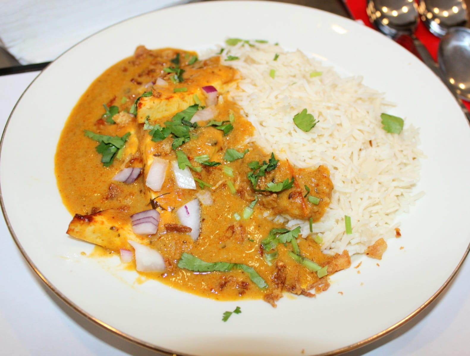 Gegrilltes Hähnchenfilet zubreitet in einer milden Joghurt-Kokonussauce mit Mandeln und Sahne oder würziger-pikanter Sauce